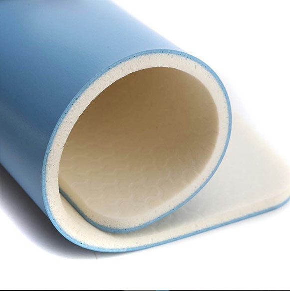 纯色平面地胶发泡层底面用纹路,合理的重量能在场地铺开后结合人工用滚地筒将地板与地面接触间的空气排出,形成相对真空状态,更加具有附着力,在运动时更具有稳定性。
